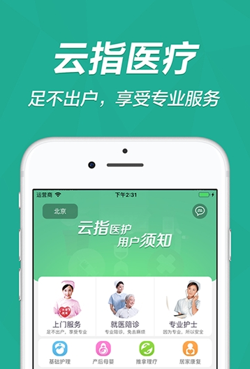 云指医护是一款提供居家护理预约服务的平台,专注于互联网+医疗的新兴概念,致力于服务更多患者,让用户避免去医院的舟车劳顿之苦,足不出户体验 专业护理。