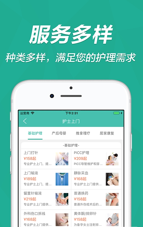 1.提供护士上门护理服务,如打针输液、换药拆线、静脉采血、维护/更换导管等基础护理