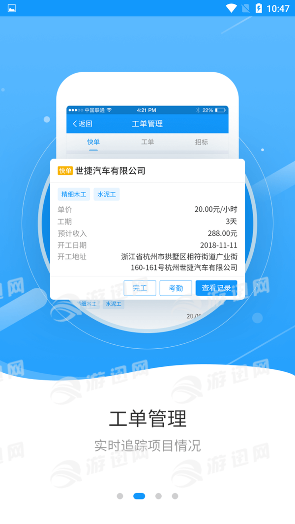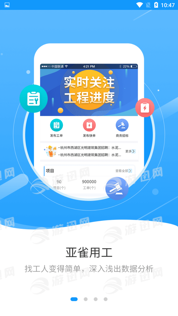 亚雀用工端,为广大用工人员推出的手机工具,帮助广大企业真正解决招工难用工难问题,项目情况,用户在手机上就可以实时追踪,消息推送及时,让你可以对事务可以及时处理。