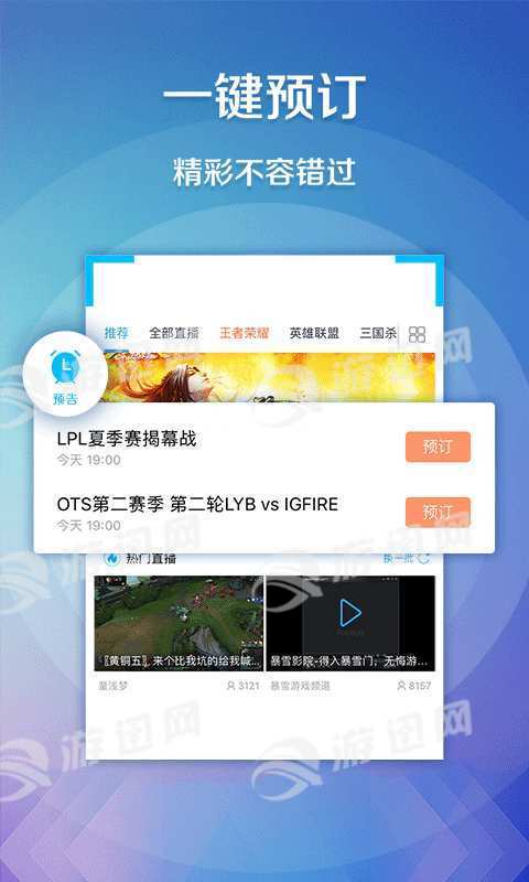 三国杀、炉石传说、英雄联盟、dota2等最热门电竞游戏的顶级赛事实时观看,让您足不出户,随时膜拜大神。