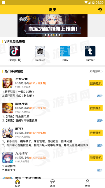 瓜皮挂机助手app内置海量热门手游辅助,可实现免root云端挂机、脚本辅助、全网VIP视频免费看等功能,深受广大安卓手游追捧,赶快安装吧!