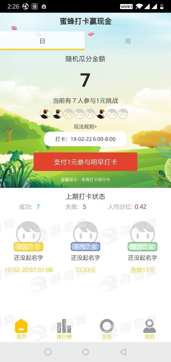 2、第二天早上6:00-8:00为打卡时间段,您在此时间段参与打卡,视为打卡成功;打卡成功不仅可以领回您所投入的打卡挑战金,还能随机瓜分当天所有打卡失败者的所有挑战金