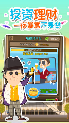 《全民大富豪》是一款的放置类养成挂机手游,还原城市模拟经营玩法;从小地摊开始经营,再进行扩建,一步步扩大经营,扩大业务;用自己赚到的钱建造装扮专属别墅、车库及城市。用富余的钱投资项目,用精准的眼光选择项目,资产翻倍企业上市,从此踏足商界,成为富豪!仿佛真正置身于一个广阔自由的大都市,让玩家拥有更深代入感。