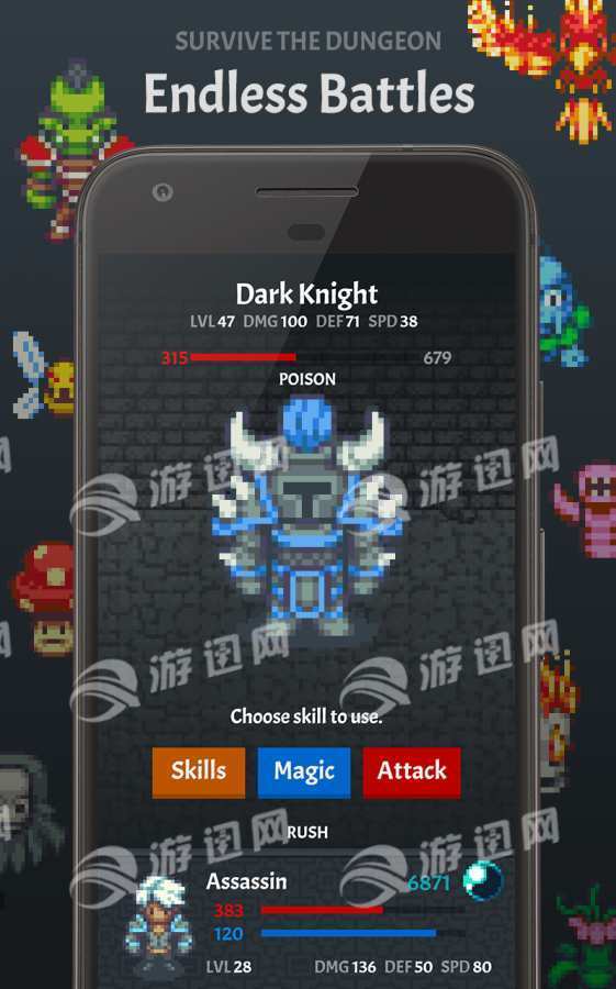 地牢之魂(Dungeon of Souls)是一款2D像素画风的魂系暗黑地牢风格的游戏!玩家只需要控制屏幕中的人物进行走动,选择战略以及技能开始你的挑战!升级技能开始爬塔!感兴趣的话一定不要错过哦!