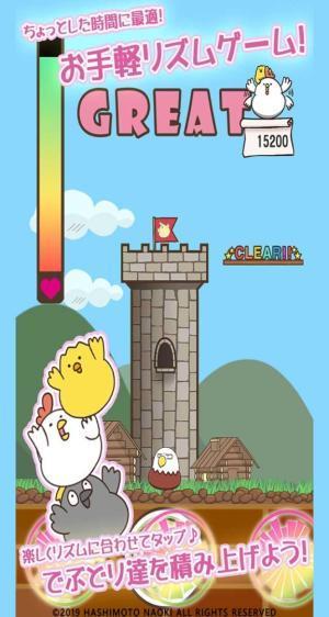 游戏玩法非常简单,玩家们只要顺著节奏点击画面上不断流过的按钮,胖鸡们就会不断堆叠往塔上方前进并获得点数,
