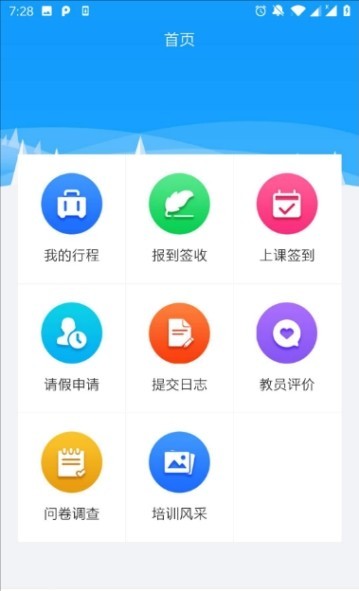 学员端应用服务:提供查看我的行程、报到签收、上课签到、教员评价、问卷调查、培训风采、请假申请等服务;