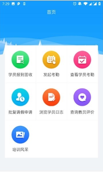 班主任端应用服务:查看学员报到签收、发起考勤、请假审核、培训风采,查看教员评价等应用服务。
