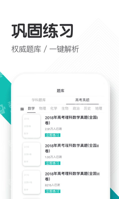 【海量题库】收录100000+道海量知识题库,在线练习,精准提分,更有百套历年高考真题以供考生随时模拟训练。