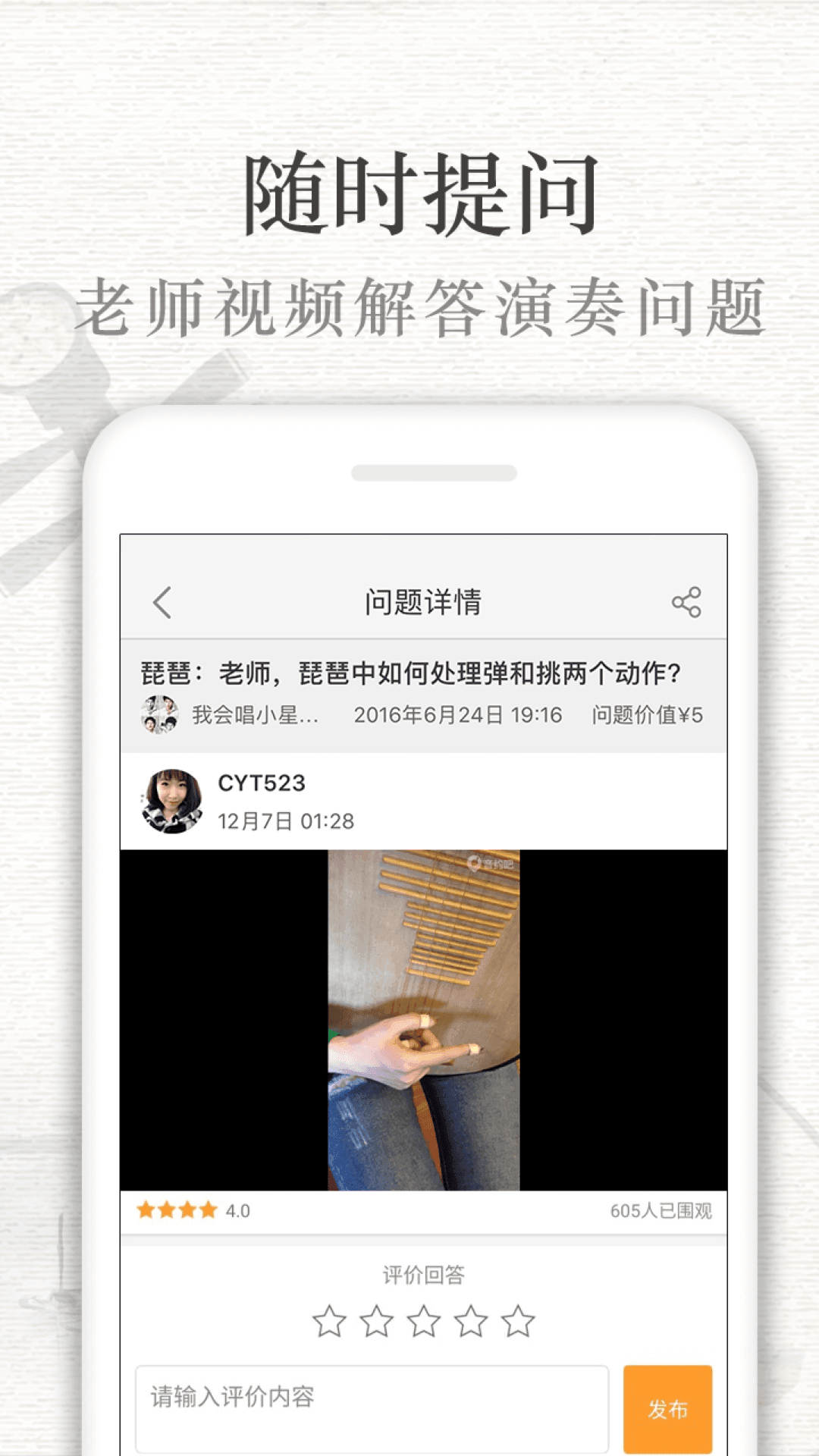 为您提供与专业老师教练的沟通平台,琵琶老师及时视频回答您的提问。琵琶APP为您提供广大琵琶爱好者交流学习的平台,学琴不再枯燥!