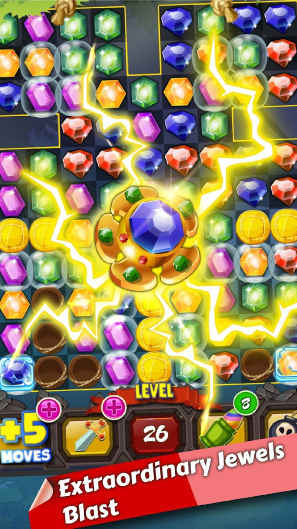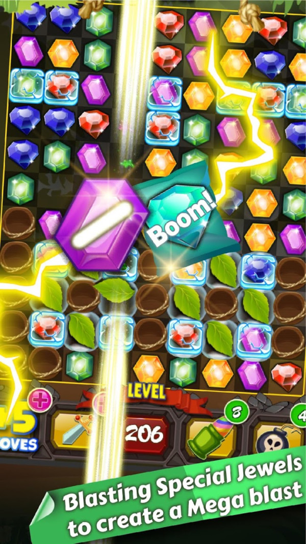 点击相同颜色的任何3级或更多相邻的宝石。享受惊人的宝石丛林探险世界。 通过匹配5个珠宝获取MAGIC宝石。使用强大的魔法宝石,获得竞争优势! 流行和经典的比赛益智游戏 ,多彩和精致的宝石闪闪发光, 通过收集更多的宝石建立你的宝藏山洞。
