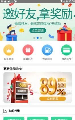 惠云油app绝对是车主朋友们必备的一款手机软件,是专为广大车友朋友打造的一个加油优惠平台,这里有超值的加油云充值卡,全国通用,绝对可以为车主朋友提供不少便利,不但免去了排队,还有很多优惠活动可以享受,最低可享8.9折的优惠,还有消费返利和推广赚佣金活动,有需要的用户快来下载体验吧!