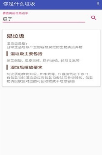 你是什么垃圾分类是一款专门为垃圾分类打造的app,垃圾分类的推行让很多人都很疑惑垃圾的种类?你是什么垃圾分类app就是帮助用户查询垃圾分类,只要输入你想查询的垃圾,就会直接告诉你垃圾的种类以及投放的要求。压面布局简洁大方,操作简单,启动速度非常快,而且占用的内存很少,是生活必备实用工具。