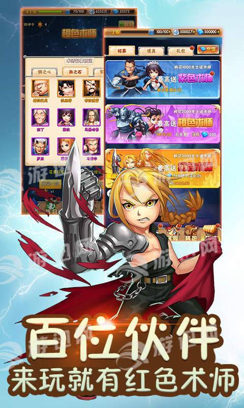 钢之炼金术士海量版游戏画面精致,全新的剧情演绎不一样的游戏世界,超大的神秘世界等待你的激情探索,不同的冒险等待你的参与,众多的副本等待你激情挑战,超多的卡牌升级路上轻松就能得到。每日还赠送众多的抽奖次数,有机会得到极品的卡牌哦,不同的卡牌威力也是不同的,赶快组合搭配出最强阵容吧。
