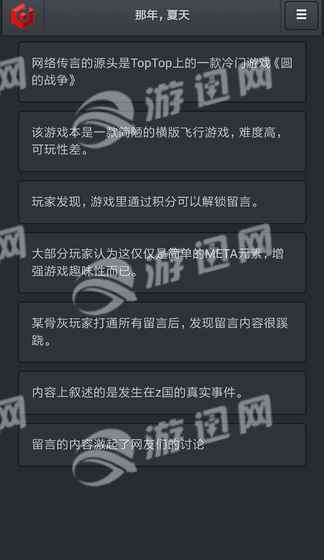 记者调查那年夏天是一款文字向的手游,在游戏中你是一位记者,你需要去调查一件很神秘的事情,随着剧情的发展你会遇到很多的选择,依靠自己的智慧,发现隐藏的真相,多线路选择,合理的处理每个遇到的事情,谨慎冒险,面对重重线索,你会怎么选择呢。