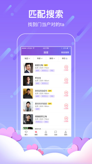 找对象是国内一款专为单身男性打造的女多男少的婚恋社交产品。随时随地发现同城的单身男女,一键打招呼功能,方便快捷;高级搜索同城、老乡、职业、学历,快速精确找到最适合你的缘分