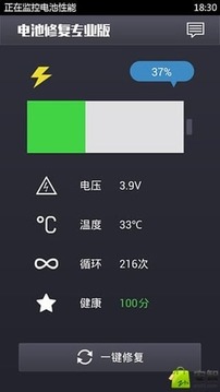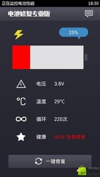 国内首款专业的电池监控维护软件,其原理借鉴国外的“Battery Repair”软件,在蓄电池充电及放电的过程中,利用升压的原理对电池进行校准及优化。独有的电池健康度评分算法,让用户随时了解手机电池目前的一个相对健康程度。保持高分值的电池健康度评分,将有利于延长电池的循环使用及更长的使用周期。 1、电池性能数据的专业监控(状态、电量、电压、温度等); 2、简单方便的“一键修复”操作,启动后即可进行全自动的修复过程; 3、贴心的后台修复、低健康度提醒功能。