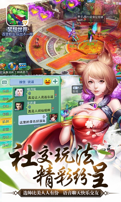 《梦想世界手机版》是由广州多益网络研发的一款趣味策略回合手游大作。游戏画面唯美飘逸,技能酷炫,极具武侠韵味,六大职业,天赋各异,战斗上手简单,PK丰富有趣,让你的梦想之旅随时充满惊喜!出色的即时语音,丰富好玩的玩法设定和神奇富有想象力的宝宝,为你打造一个轻松愉快的娱乐互动社区!让你在体验巅峰战斗的同时,还能感受交友的愉悦。