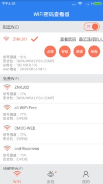 本软件是一个实用软件,是wifi钥匙、wifi连网神器、wifi共享精灵和wifi伴侣的的一种共用的密码查看器,功能比较简单,可以查看android手机曾经成功连接的wifi热点的密码,(即当你成功连接到某wifi网络,但过了一段时间忘记了密码,可以在本软件里查看密码,但是使用前要获取root权限),可以对当前wifi进行测速的一款多功能wifi工具。