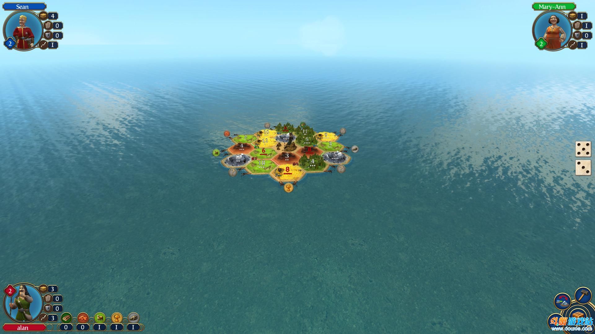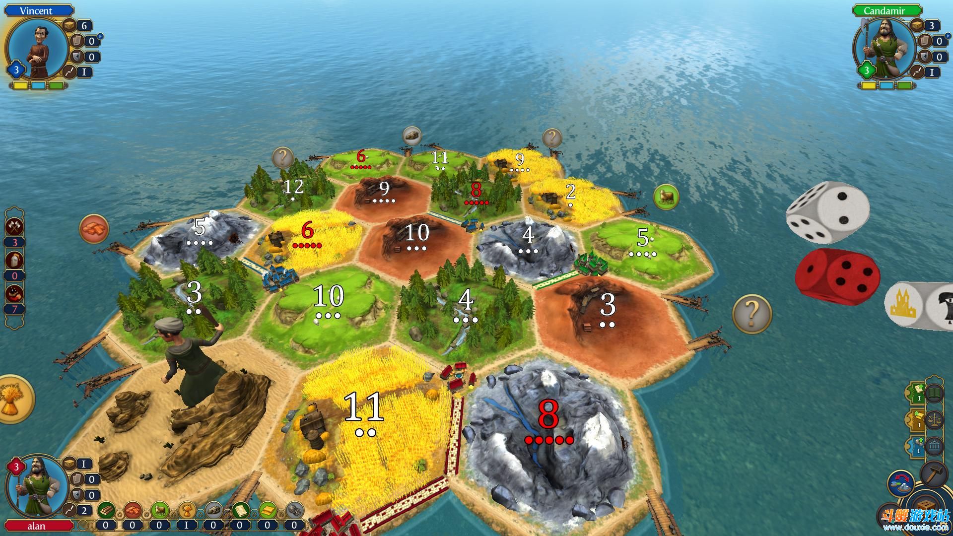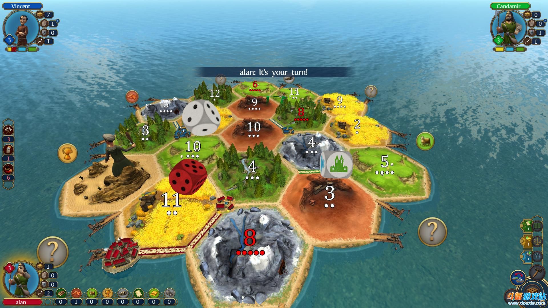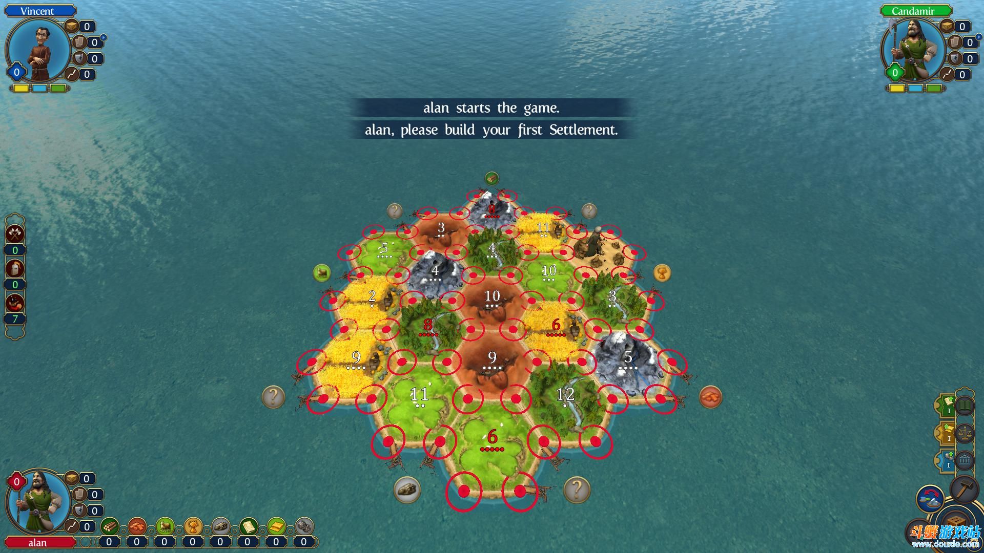 《卡坦岛造物主版》属于战棋类游戏,所以只需鼠标点击即可。游戏开始选择2个地点建造房屋当做开拓的出发点,然后开始摇骰子,点数如果和资源点上的数字相同就可获得资源,有了资源就可以建造其他建筑发展城市。