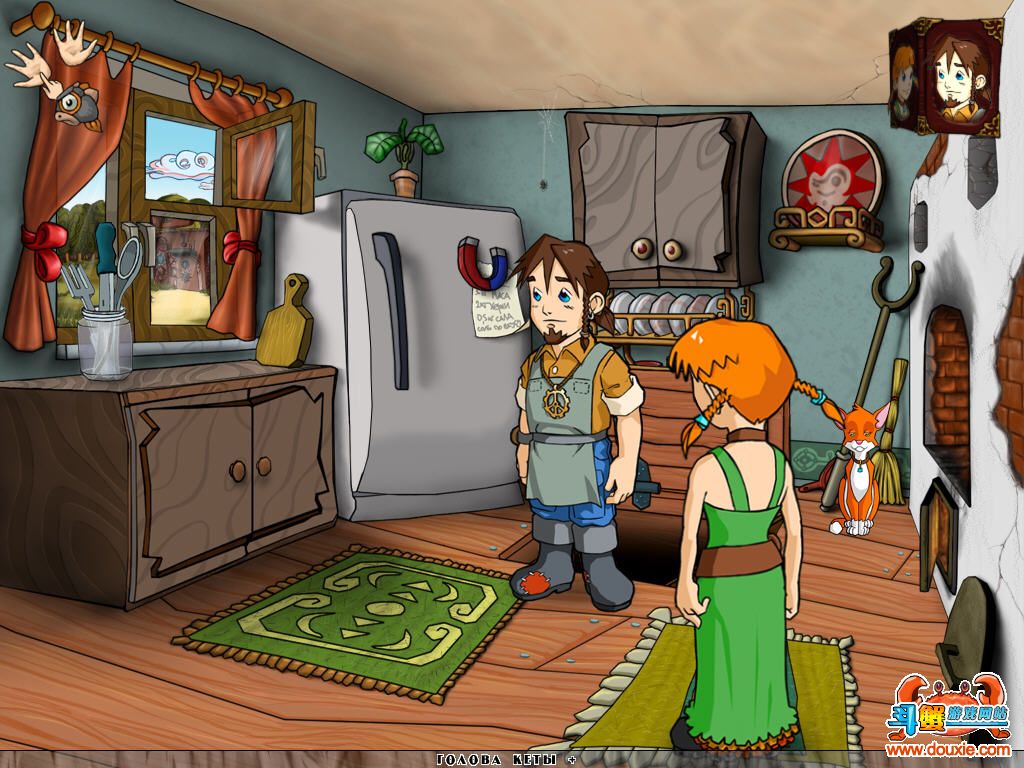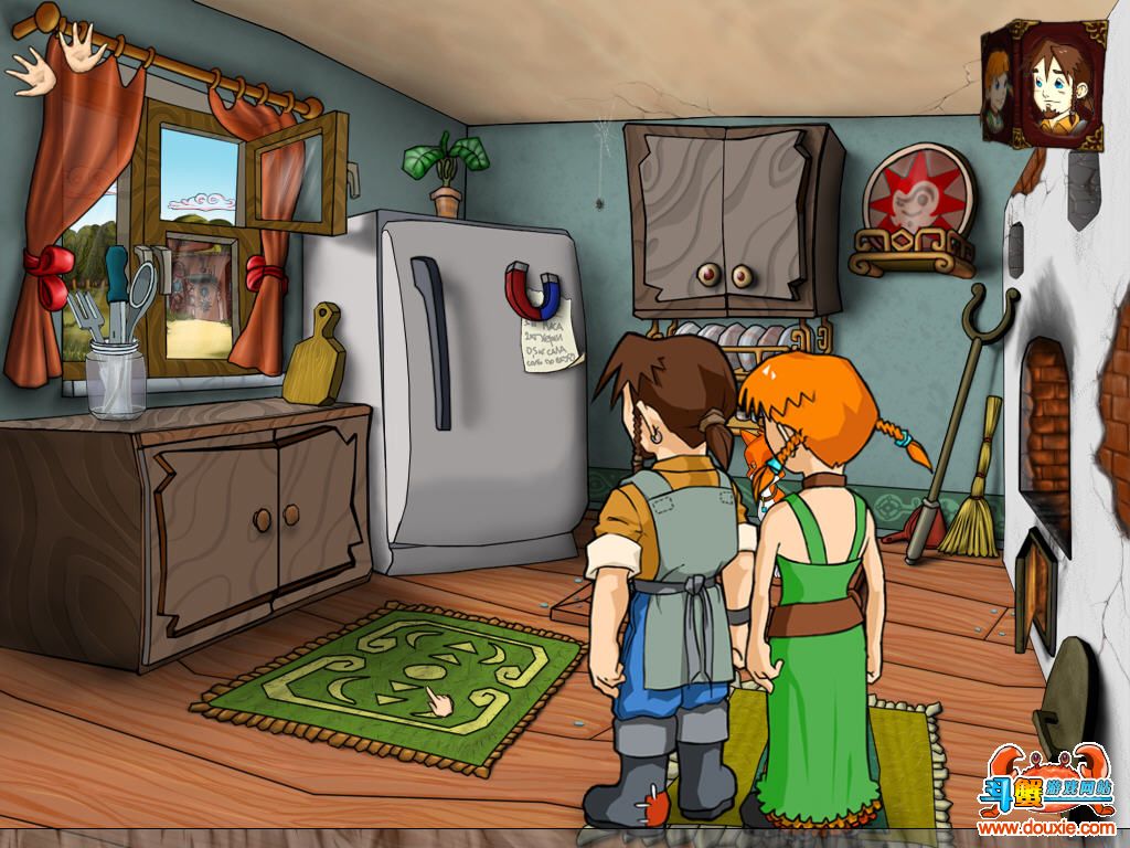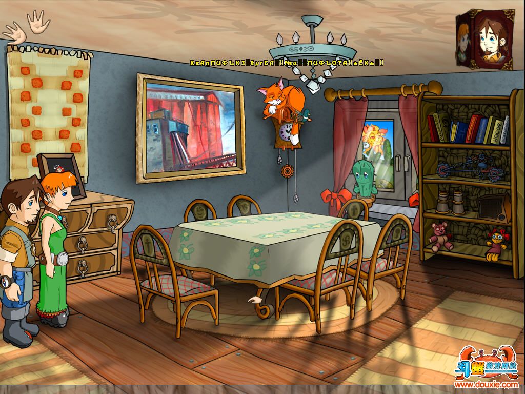 游戏一共有三个主要角色,托托(女孩)、波波(男孩)和一只猫咪。点击屏幕右上角可以转换控制托托和波波。在游戏过程中,如果需要猫咪帮忙,可以把鱼头扔给它。 'I>USl3hI 另外,点击鼠标右键可以跳过对话。第一章 早晨起床后,托托从床下捡到一个鱼头,从屏幕下方离开来到餐厅。波波走到书架前打开收音机,窗子自动打开了。拿起望远镜看看窗外的景色,点击屏幕下方退出望远镜。 从屏幕右下角到门厅,看到衣架上面放着个背包,可是太高了够不着。波波把鱼头扔给猫咪,但它的爪子不够锋利上去后掉了下来。查看一下左边的门,发现钥匙不见了。 从屏幕右下角到厨房,托托打开了冰箱从里面拿出一盒牛奶,返回门厅,把牛奶倒进盘子里。离开门厅到别的房间转一下,回来后发现钥匙在盘子里。用钥匙开门到院子里。 一直往左走,波波进入了自己的工坊。往右走到里屋拉下电闸的把手,工坊里有电了。回到工坊的外屋看到里面有一台打磨机,点击猫咪跟它交谈后,它用打磨机把爪子磨得锋利了。离开工坊回到房子里,再把鱼头扔给猫咪让它去够背包。拿到包后就可以带更多的东西了。先收起衣架上的绳子,去客厅,拉开柜子右上抽屉,关上后再打开,拿到一只旧袜子,从最下面的抽屉里拿到一个呼机。 到厨房从冰箱上拿下磁铁。托托打开冰箱边的柜子,从左边的门里拿出一个罐子放在柜子上,再从右边的门里拿到洋葱和漏斗,从冰箱里拿蛋糕。墙上的柜子左边的门里拿一瓶胡椒粉和一盒火柴。打开地上的门,波波想下去,可是太黑了。波波想应该有一根蜡烛。 到工坊从左边墙上的飞标盘上拿下一把刀,再去拉动思想创造机的把手,波波用机器画了一张蜡烛的图纸,看看上面需要的东西。到工坊的里屋,从一大堆零件里拿到一根管子和一个铁盒子。回到房子前,到蜂窝里去拿蜂蜡,可是蜜蜂却飞来飞去的,还不能拿。趁蜜蜂飞到屋里的花上采蜜时,波波让猫咪去抓乌鸦屋下面的杆,乌鸦掉了出来,猫咪把地上的耙子撞了起来把窗户关上了,蜜蜂被关在了屋里,波波从蜂窝里拿到了蜂蜡(如果没成功就回到屋里打开收音机,窗户会自动打开)。到工坊的里屋,把蜂蜡放进煤油炉上的空杯子里,用火柴点燃煤油炉,等蜂蜡融化后拿起杯子。到外屋,依次把管子、绳子和蜂蜡放在工作台上,蜡烛做好了。 到厨房,用火柴点燃蜡烛,波波拿着蜡烛下到了地下室。从口袋里拿到土豆、胡萝卜、卷心菜和甜菜,再从架子上拿一个玻璃瓶,返回厨房。托托把洋葱、土豆、胡萝卜、卷心菜和甜菜放进了柜子上的罐子里,再把罐子放进右边墙上的炉子里,炉子里掉出来一个弹簧。汤做好了开饭了。