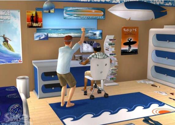 用滑板和衝浪板壁饰来装饰模拟市民的房间,反映出他们急躁却又慵懒的生活方式。