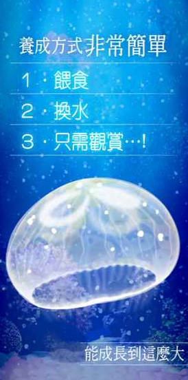 ・本游戏设有通知喂食以及换水时间的功能(可以通过手机的设定更改为有效或无效。只是如果忘记喂食或换水海蜇便会死掉、我们建议您将通知设定为有效)。