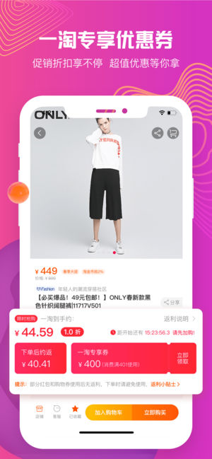 1、淘宝账号通用,无需单独注册;同步淘宝/天猫海量返利和优惠券商品。