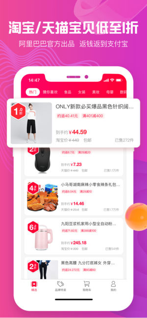 【淘宝出品】阿里巴巴集团旗下官方返利特卖APP,汇集淘宝,天猫海量返利和大额优惠券商品,商品全,返利额度高,官方渠道返利,直接返利到你的支付宝账号,安全无忧。再加上专享优惠券,省不停!