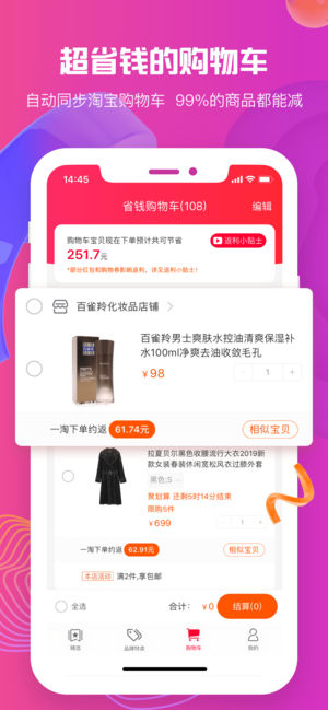 一淘是阿里巴巴旗下特卖返利平台,无需注册账号,淘宝账号一键登录,30秒淘宝购物车下单直接拿返利,最高返利80%,还可叠加专享大额优惠券,返利再减;一淘是精明用户不可少的省钱返利神器!