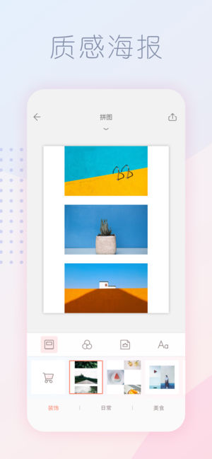 根据选择的照片自动生成各式模版,模版可依据不同需求切换至不同比例;
