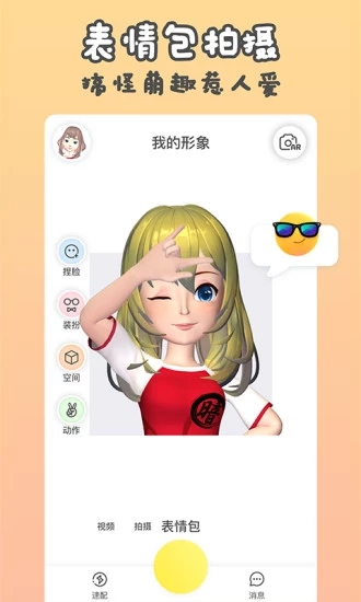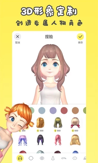 每个人都可以捏制自己的3D虚拟人物,这就是你在这个虚拟世界的人设。你可以DIY脸型眼睛眉毛鼻子嘴巴等所有五官,同时基于人脸识别技术,你可以实时的驱动这个人物。