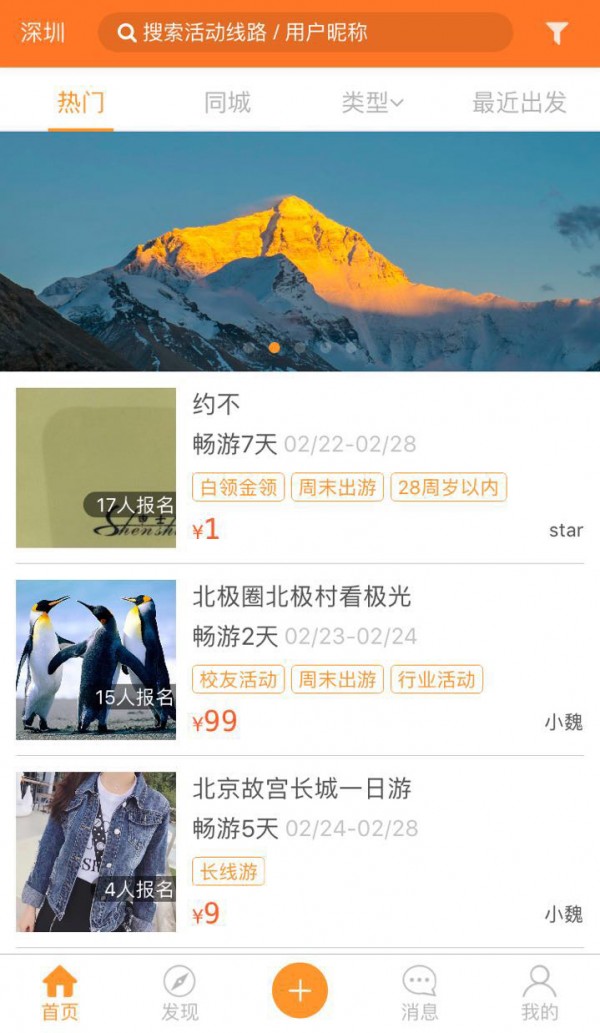 在遇游邦,你遇到的都是和你一样的人,在这里,你不用担心孤独,在这里,相约一起爬爬山、打打球、吹吹风、聚聚会、旅旅游、散散心……