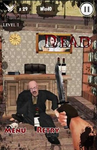 飞刀王2:射死老板操作方法非常简单,玩家只需要利用手机晃动控制方向,点击萤幕投掷击中目标,注意好了,可别射到老板了;当你射到人的不同部位时都会有不同的死法;累积到一定的关卡数还会有许多面具可以搜集哦~