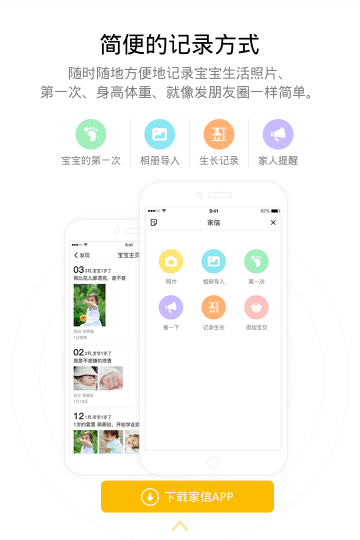 简单的记录方式——随时随地方便地记录宝宝生活照片、第一次、身高体重、就像发朋友圈一样简单。