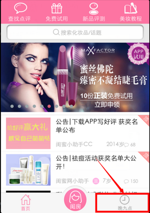 6、 市面最火的美妆论坛“闺蜜晚九点”重磅推出,支持发帖、收藏、回帖、插入图片产品等相关功能,在这里和蜜友们玩转美妆和健康7、 新品评测栏目,让你第一时间掌握最新产品性价比8、 美妆教程,教你如何一秒钟变的更美9、 一键分享资讯、试用把美丽的秘密告诉身边的闺蜜