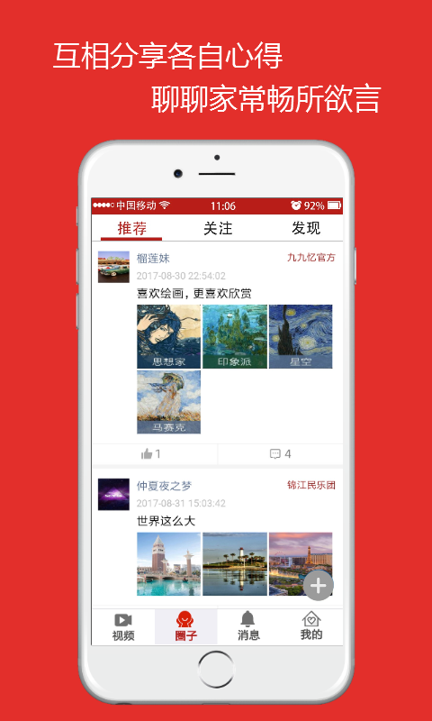 九九忆是专门为中老年朋友打造的一站式文娱、社交、健康服务平台。平台提供短视频拍摄分享服务、圈子社交服务、健康养生资讯、文化旅游资讯、各种生活小常识、兴趣爱好视频教学,全方位、多层次的满足中老年精神文化需求和健康养生需求。