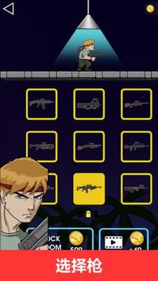 选择不同的人物去操控,并拿起手上的枪去射击打败敌人闯关,可以通过使用金币去解锁不同威力的枪支。从而提高通关的顺利度。