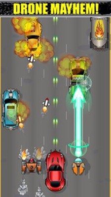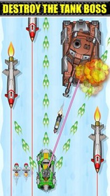 * 一边躲避随机火箭、导弹和路障,一边跳起来获取提升道具、加速、修理、分数加倍、吸金磁铁等各种小道具, 从而获取额外优势,横扫敌人和BOSS。