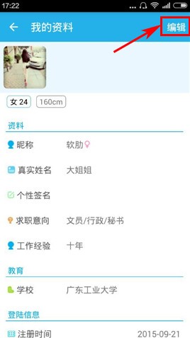 2)点击右上角的【编辑】然后点击下方的编辑框输入个人信息,然后点击右上角的【按钮】即可。(如下图)