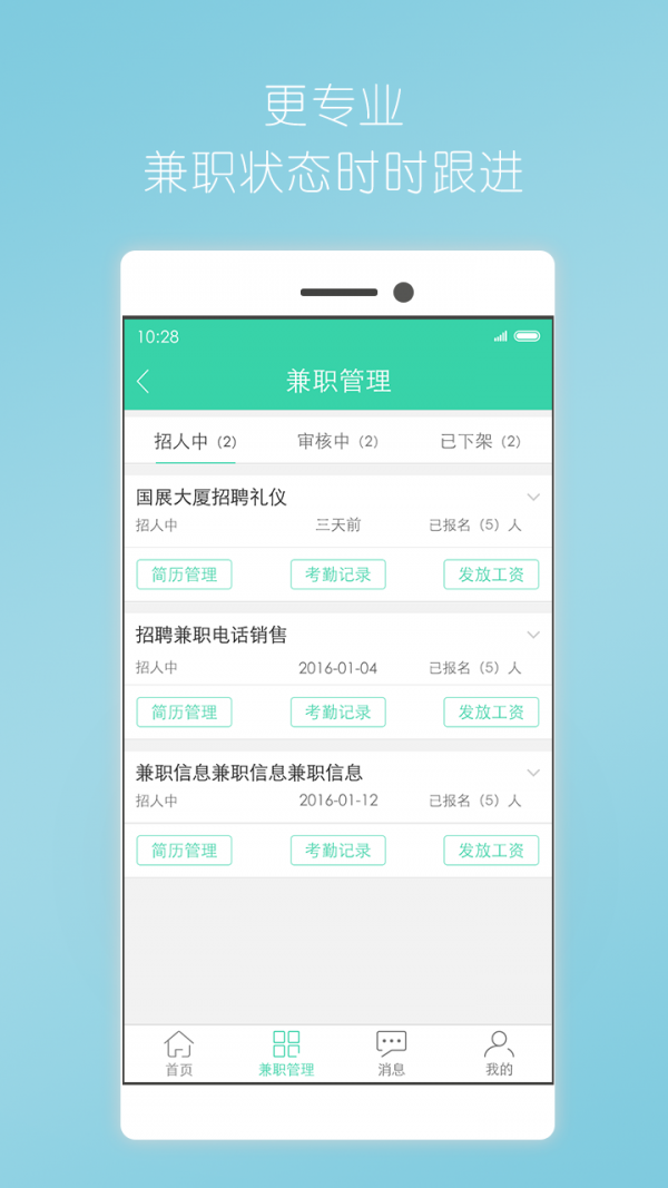 e兼职企业版是一款专业的企业招聘应用,能让您随时查看求职者的详情,审核职位状态,是您招聘的好帮手。