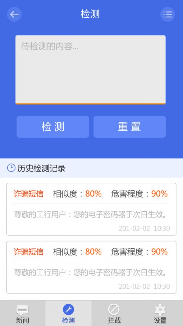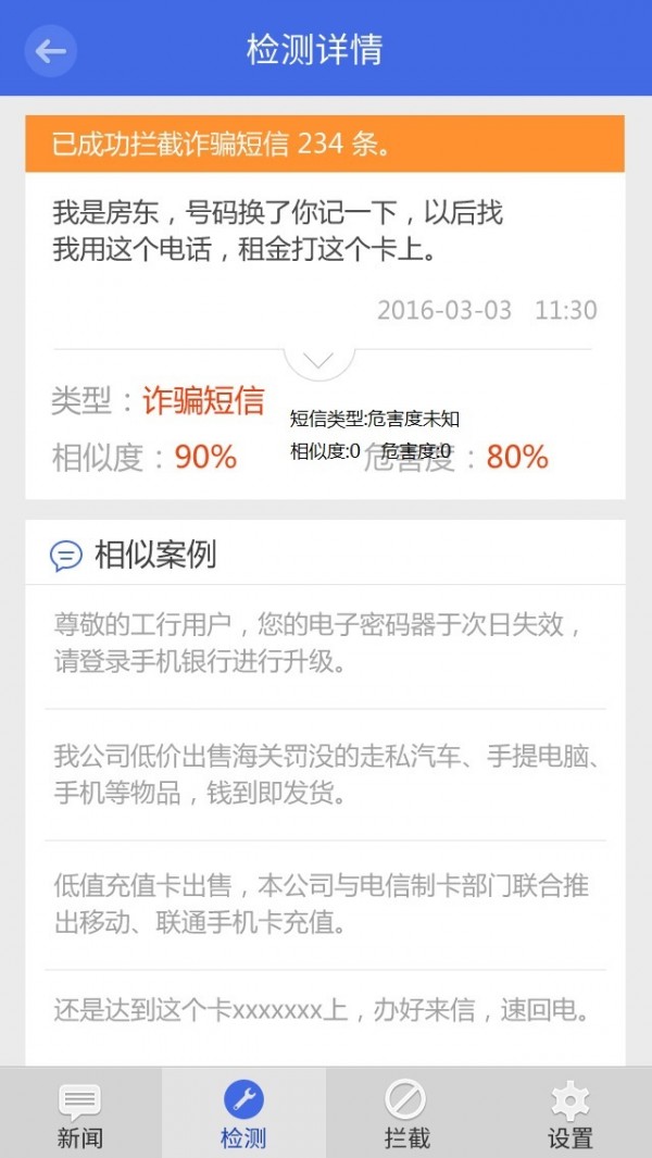 公安厅定制防骗助手 智能拦截诈骗短信 智能识别诈骗电话 智能识别木马网址 智能识别诈骗银行卡 公安厅时时更新诈骗短信模版 可以预防诈骗短信内容