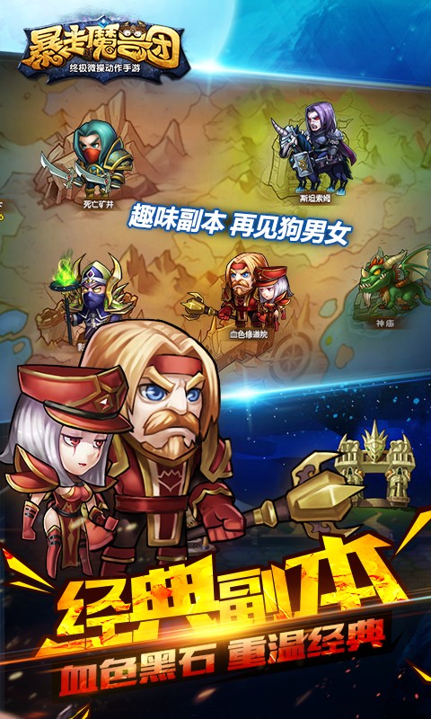 经典副本还原,血色狗男女,勇闯死亡矿井,与深渊恶魔基尔加丹上演生死对决,策略新玩法,巧妙布阵释放合体大招,华丽技能酷炫爆屏;指尖战斗有你掌控,艾泽拉斯谁将为王,勇士,可敢一战?