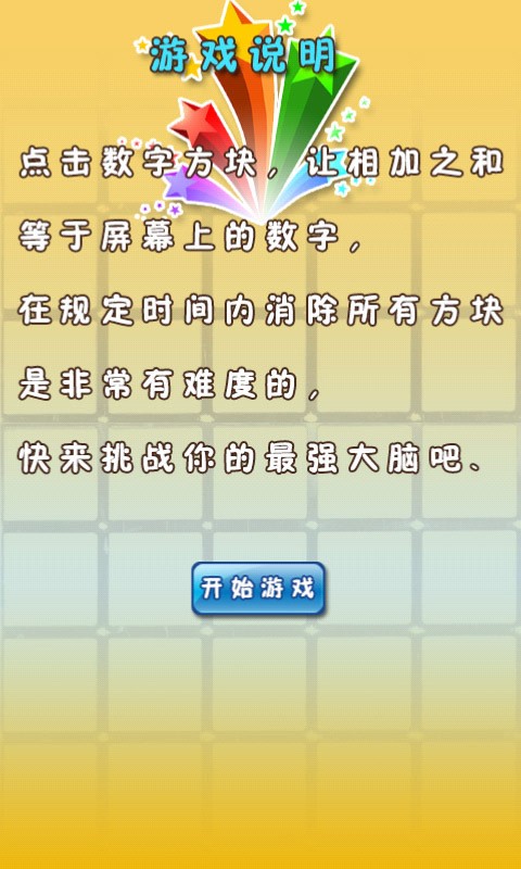 不要再感叹最强大脑节目中的牛人,快来挑战属于你的最强大脑吧, 这是一款极其考验脑力的数字运算游戏, 简单,游戏规则就是两位数内的加法, 刺激,想要顺利过关可没那么容易, 游戏中点击数字方块,让相加之和等于屏幕上的数字即可消除, 想在规定时间内消除所有方块是很有难度的, 你敢来体验前所未有的脑力激荡吗?