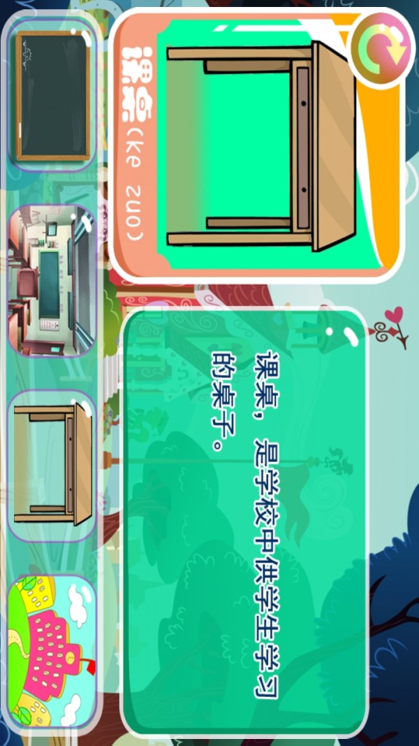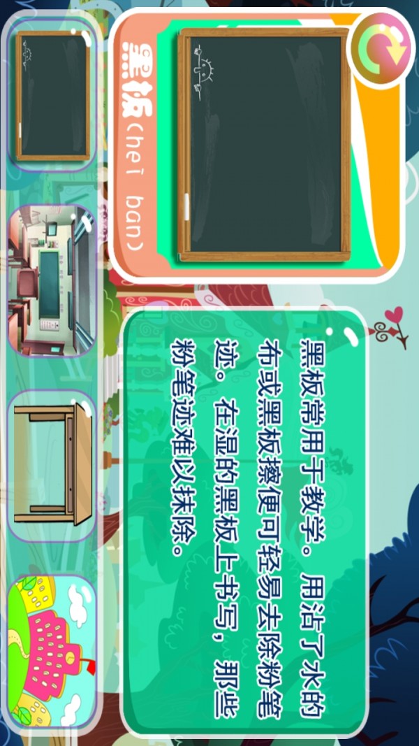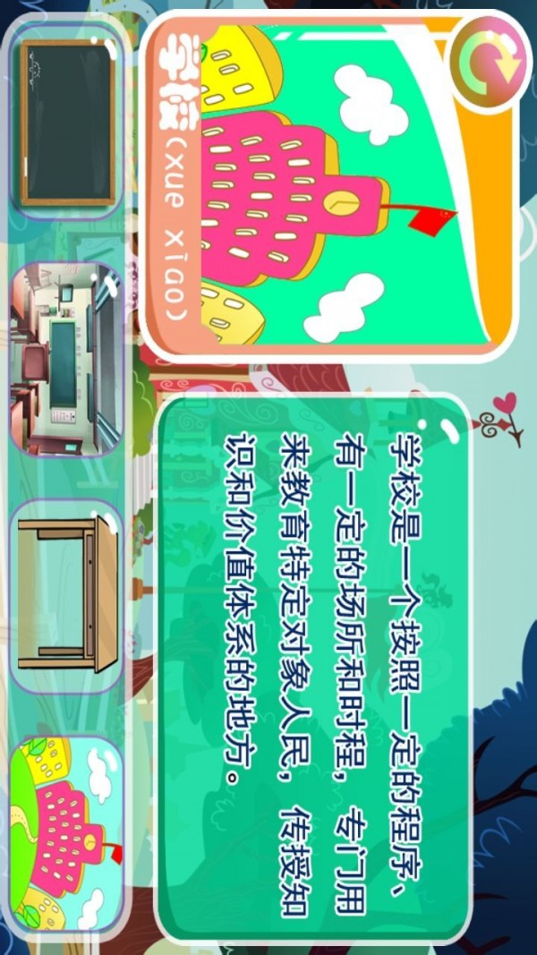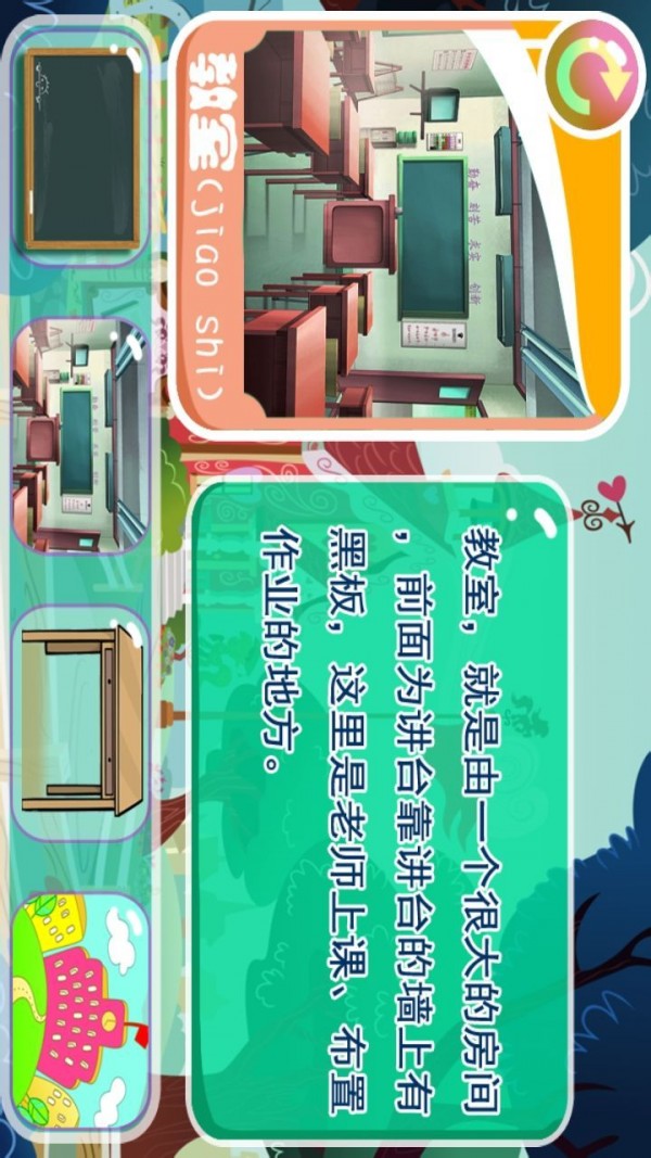 我上学了趣动课堂是一款适合儿童启蒙学习的游戏。儿童教育,认识学校。通过声音和卡片的形式让小学生了解学校中常见的人和物体,每张卡片包括了卡通版肖像以及有声的介绍。