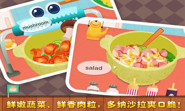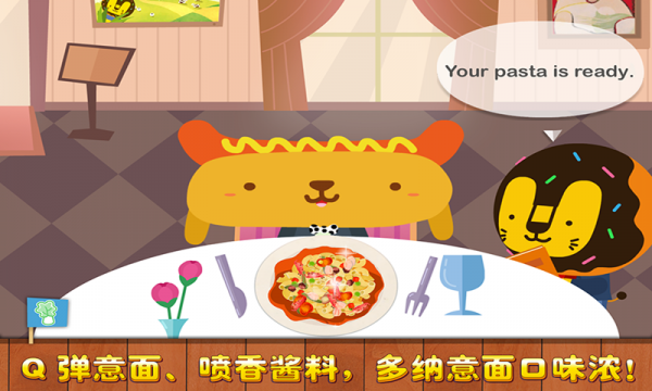 多纳宝贝餐厅是一款情景类学习游戏,游戏中有着30多种食材,有着各种厨具可以使用,在制作食物的同时,还能学习食物的英文名称,以及常见英语用餐口语。