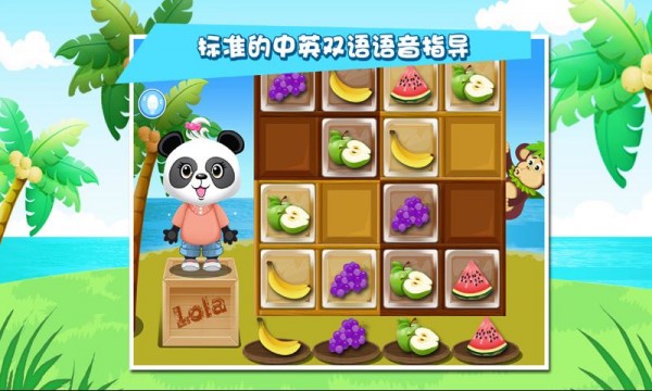 水果在一个3x3的格子里。游戏里有非常吸引人的动画操作指导,点击即可控制游戏。“困难”级别里使用数字在4x4的格子上玩游戏,这样给稍大年龄段的小朋友们也提供了新的挑战和乐趣。而且,这款游戏协调地设计了较平稳式的梯形游戏难度,有三种难度等级可供选择。