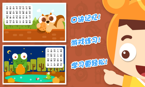 熊宝宝拼音以拟人化的拼音小怪物为主体,生动形象的教授孩子们拼音的基础知识。其内容融合了声母,韵母,整体认读,声调,顺口溜,小游戏练习等多个模块,让孩子们能更迅速,更轻松,更愉快的掌握基本的拼音知识。