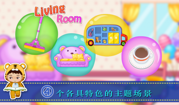 【茶几】【沙发】【拖地】【玩具柜】这4个独具特色的场景,每个场景包含1-3种精致的小游戏玩法,通过游戏的方式,让孩子养成整洁,自律的好习惯