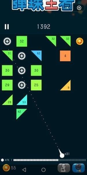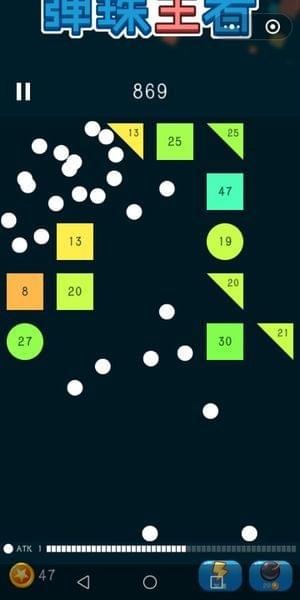 5、屏幕最下方的进度条表示你的小球数量,加一个小球就加一格,满格为50,ATK1满了之后升级为ATK2,球会减少成25个,并且变成绿色,但是绿色小球弹一次砖块砖块数字减2。