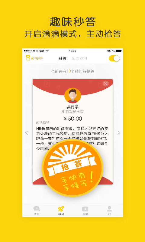【秒问秒答】,开启秒答按钮后,当用户发起秒问时,系统将自动匹配契合度高的在线顾问,为用户提供解答。充分发挥顾问的碎片时间,创造更多价值。